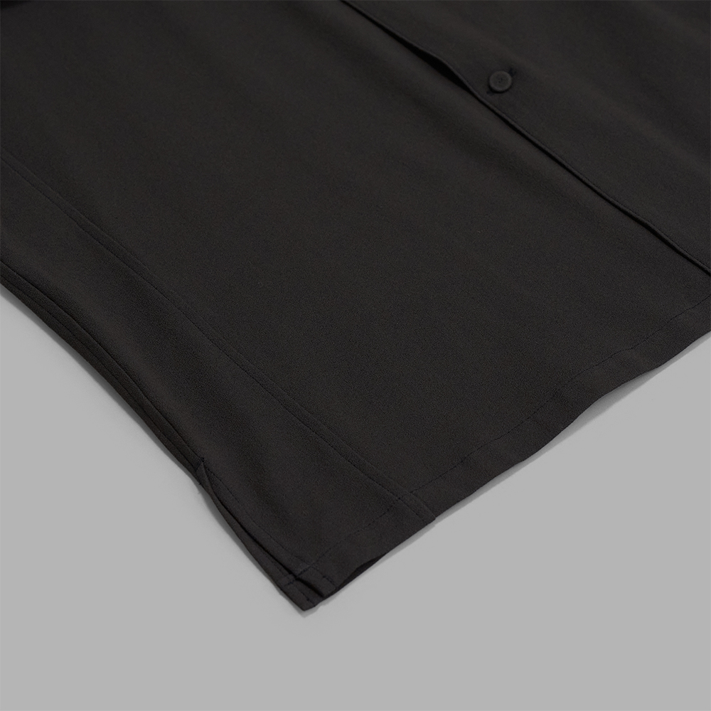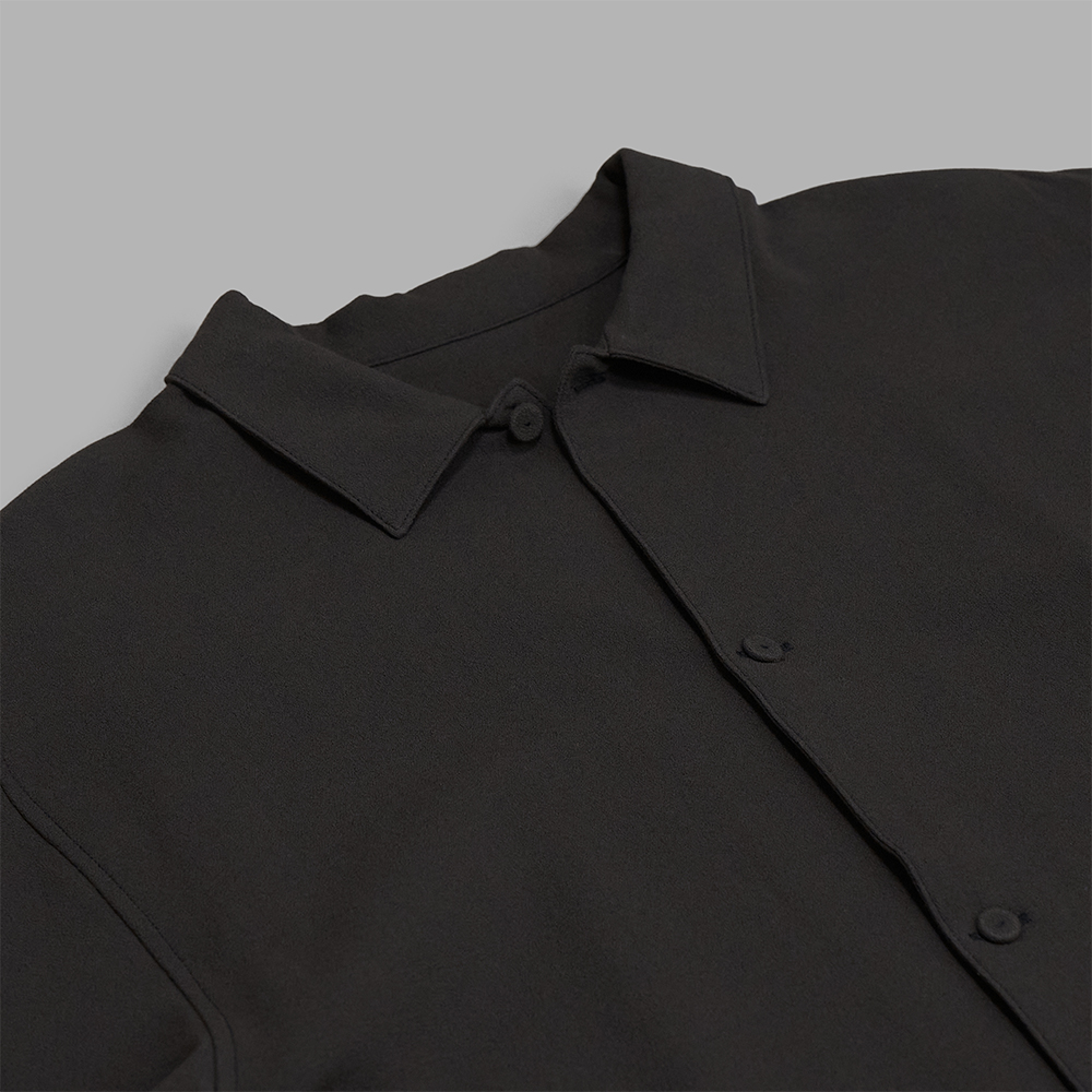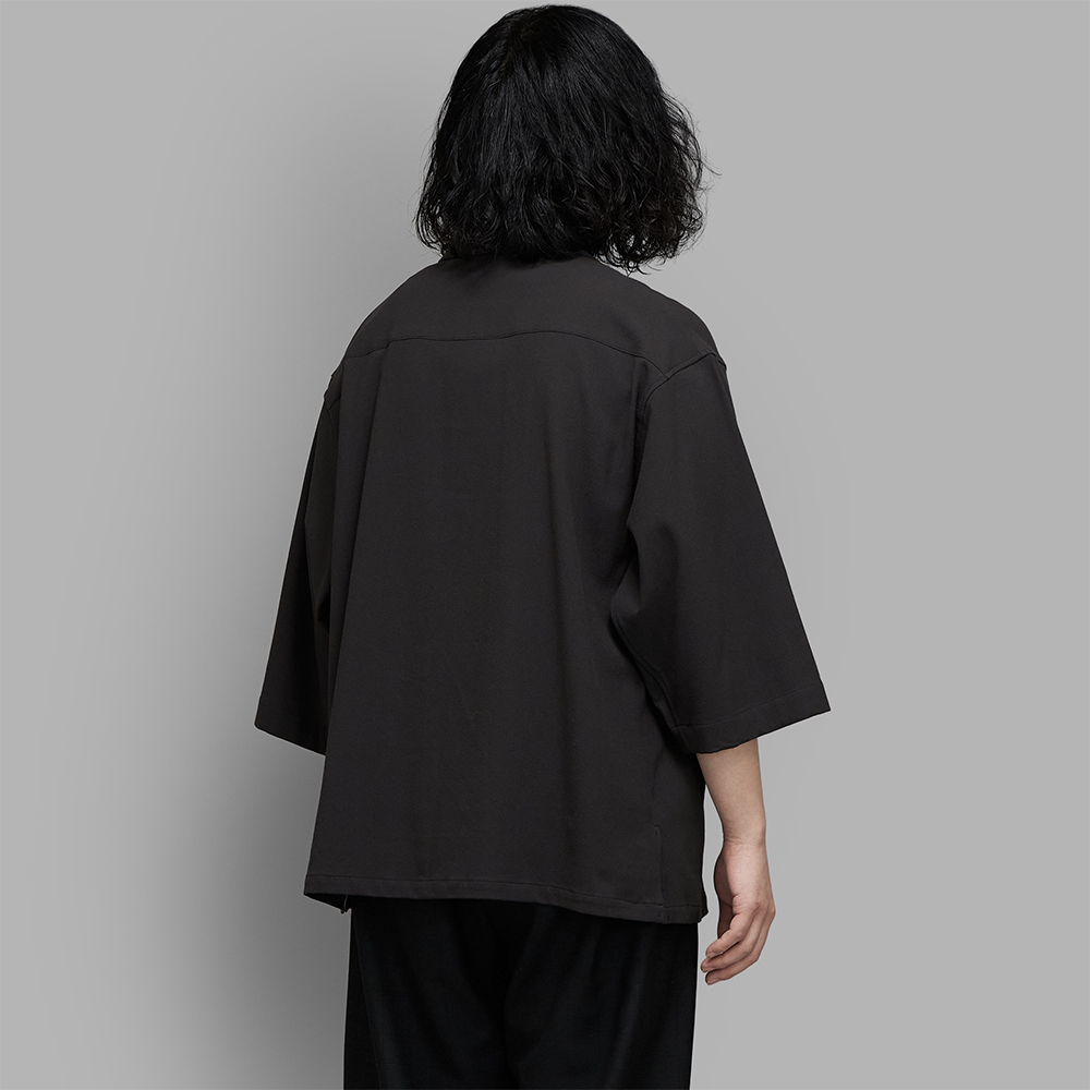 身幅と袖幅を広めにとった、八分袖が特徴のリラックス感のあるシャツです。しっかりとした生地感と立体的な衿の印象により、半袖ジャケットのような感覚でも着用できます。ボタンには本体生地を使用した包みボタンを採用し、全体をやわらかくマットな印象に仕上げています。